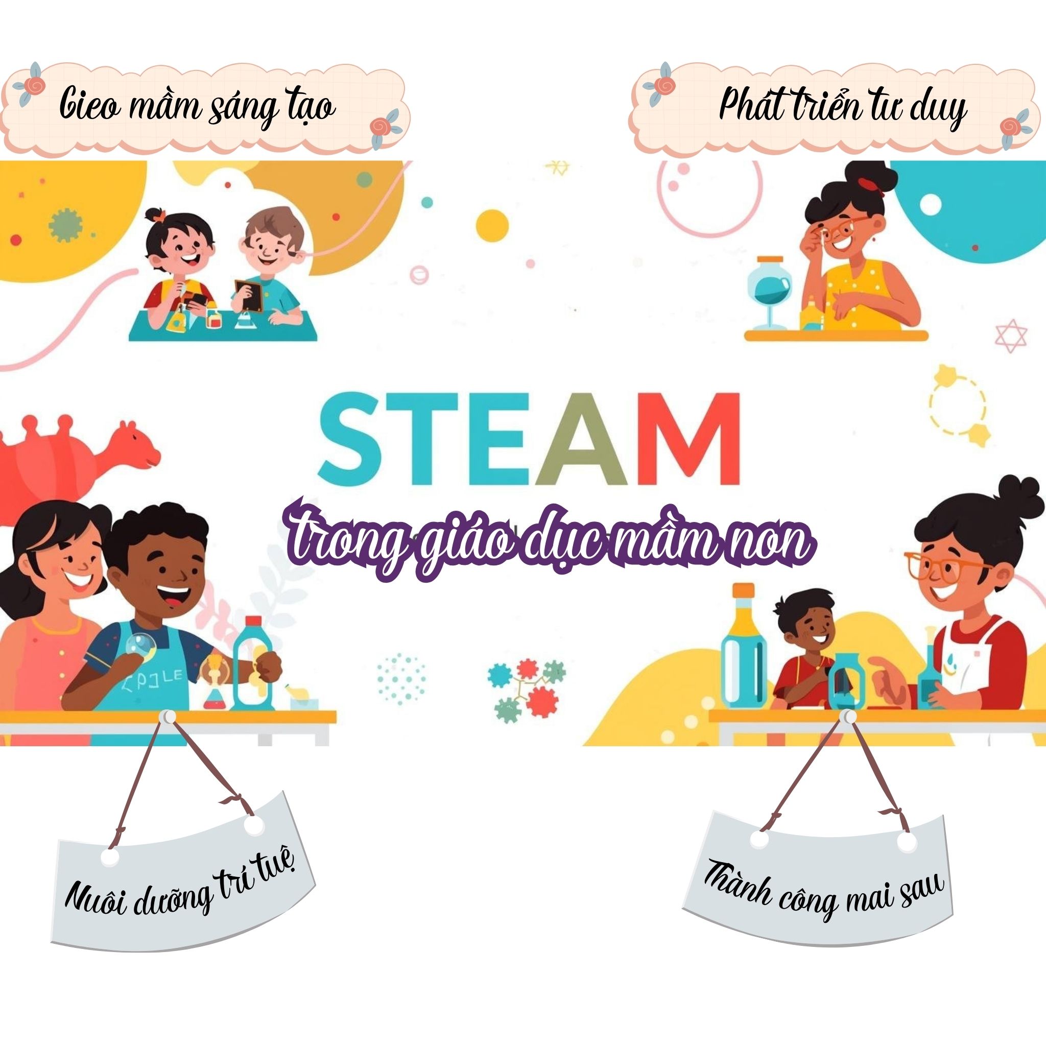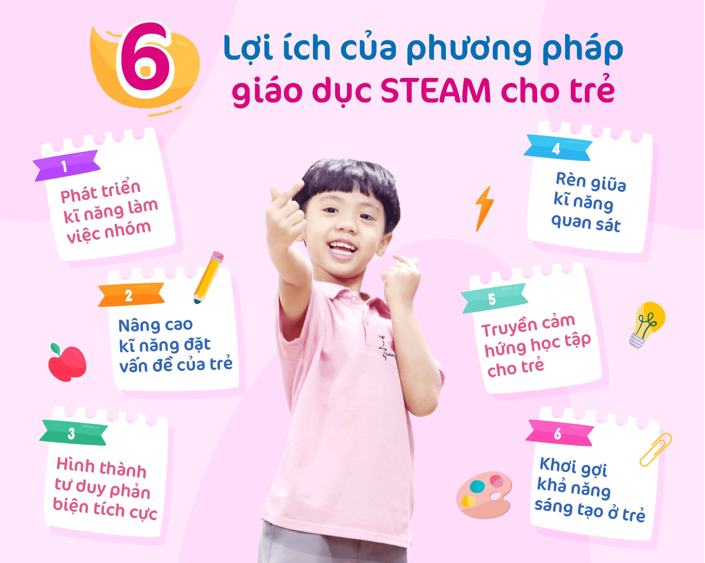STEAM kích thích sự tò mò của trẻ về thế giới xung quanh, khuyến khích trẻ chủ động sáng tạo để tìm tòi và giải quyết các vấn đề gặp phải. Mỗi bài học trong chương trình là các tình huống thực tế để trẻ vận dụng kiến thức đã học giải quyết vấn đề trong cuộc sống đồng thời rèn luyện và phát triển các kỹ năng quan trọng.