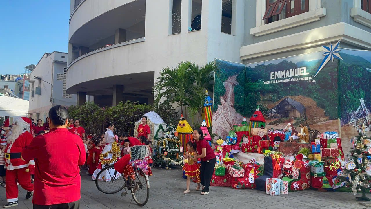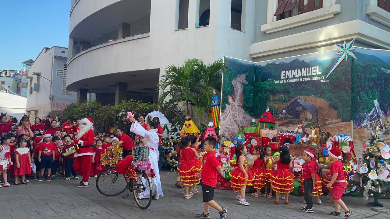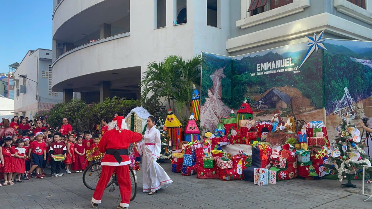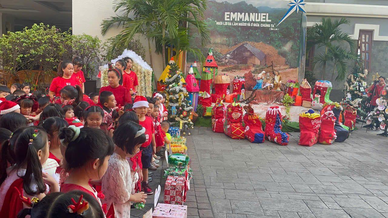 Noel về, Tiết trời Sài Gòn se lạnh . Hôm nay các bạn nhỏ Trường Mẫu giáo Bông Hồng vui đón Noel bên các Soeur, các cô và bạn bè. Những nụ cười tươi, những điệu nhảy múa rộn ràng, những ánh mắt lấp lánh niềm vui khi được ông Già Noel tặng quà… Năm nay, Quý Soeur, Quí cô dạy cho các Bé biết có các bạn nghèo, đặc biệt các bạn nghèo Làng Nủ, các bạn bị ốm trong các bệnh viện, không thể vui chơi Giáng Sinh, và đón tết giống chúng con. Chúng con chẳng có gì nhiều, chỉ có một ít quà nhỏ mà ba mẹ cho tiết kiệm để hôm nay chúng con Kính Dâng Chúa. Kính xin Chúa cho chúng con được gởi món quả nhỏ này đến các bạn nghèo, qua cuộc thăm viếng trực tiếp của Qúi Dì Quí cô.
